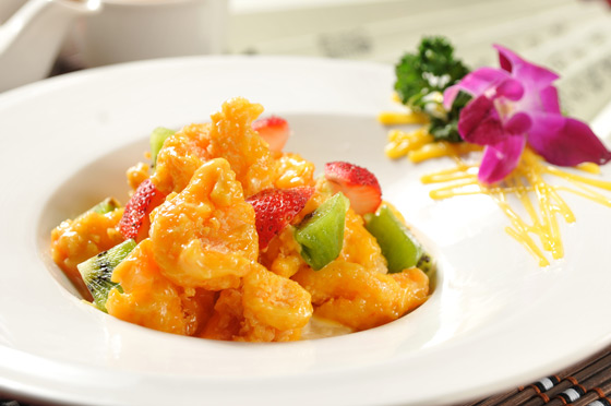份量十足的鮮蝦仁,鮮脆飽滿的蝦肉,以特殊烹調方式將蝦肉的甘、香、甜鮮明的鎖住,創意添加多種新鮮水果提味,酸酸甜甜的清香,與脆口蝦球呈現絕妙的口味。
