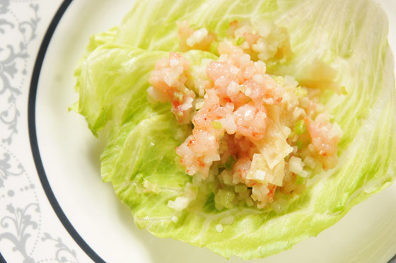 蝦鬆料理常常是品嚐港味、北京菜等料理時必點的食材!豐富的蝦肉丁、芹菜與精彩配料製作迷人的多層次蝦鬆,新鮮生菜包裹,感受多汁的鮮甜或單吃下飯,都讓人難忘。