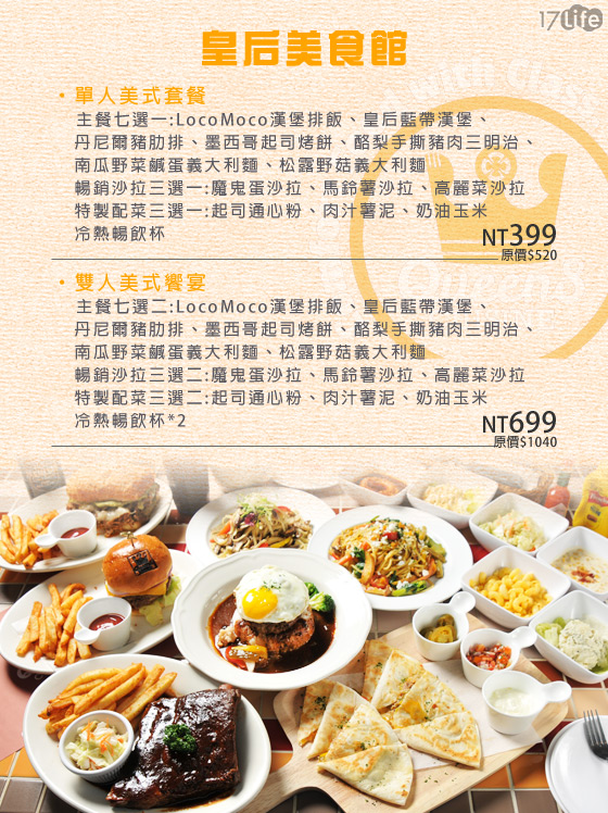 你知道什麼是真正的「美式料理」嗎?將各國料理結合自創的烹煮方式,賦予料理新的個性,這才是美式料理真正的意涵。皇后美食館要重現世界各國文化精華,讓大家每天都吃進健康與開心。