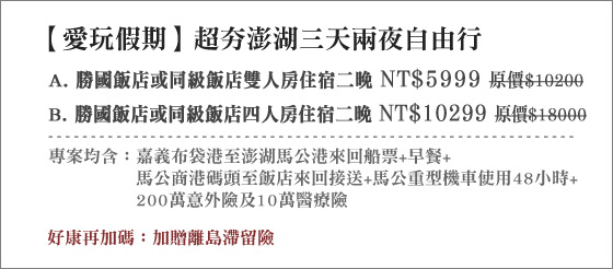 ●好康再加碼!現在購買再享「離島滯留險」,保障多多玩得更安心!