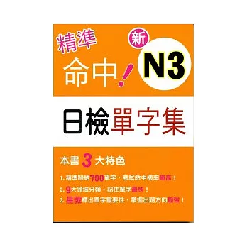 《精準命中!N3日檢單字集》並參考出題基準,精準預測出題方向。此外,有別於世面上一般的日檢單字書,本書是以領域來分類單字,分為「生活」、「學校」、「性格」、「文化」、「自然科學」、「商業經濟」、「副詞」、「片假名」、「其他」,9類單字,相信此種分類能讓讀者體察單字的關連性,絕對有助於記憶。此外,本書將我們預測極有可能出現的單字用星號標出來,讓讀者在背誦時能多加留意。
