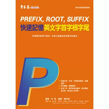 本書蒐集常用字首、字根、字尾單字,由淺入深,適合任何程度的學習者,讀者能夠學習英文構詞的規則來判別與記憶單字。初學者可由本書學習單字的字首、字根、字尾之奧妙與學習訣竅;進階者可藉本書驗證所學字彙及其衍生字,融會貫通後更能加強英文實力。