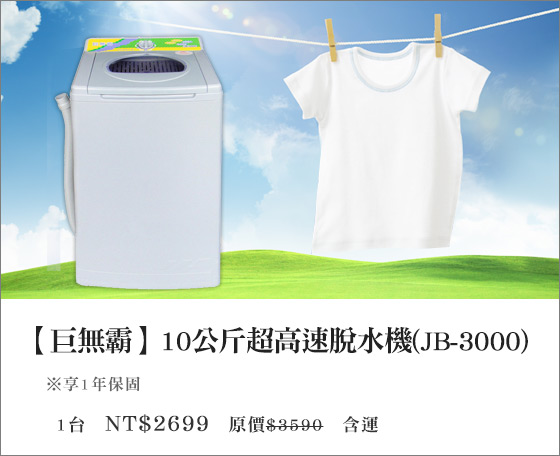 分享推薦.QQ冷凝膠涼墊讓您今夏省錢又健康 !>巨無霸-10公斤超高速脫水機(JB-3000)好用.巨無霸-10公斤超高速脫水機(JB-3000)推薦.評價.熱銷.開箱文.巨無霸-10公斤超高速脫水機(JB-3000)優缺點比較